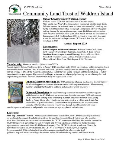 Check out the new Winter 2024 edition which includes the Annual 2023 Report of the Land Trust, new Board members, stewardship, leaseholder changes, and articles by our Board members with Finances, the Annual meeting and more.
